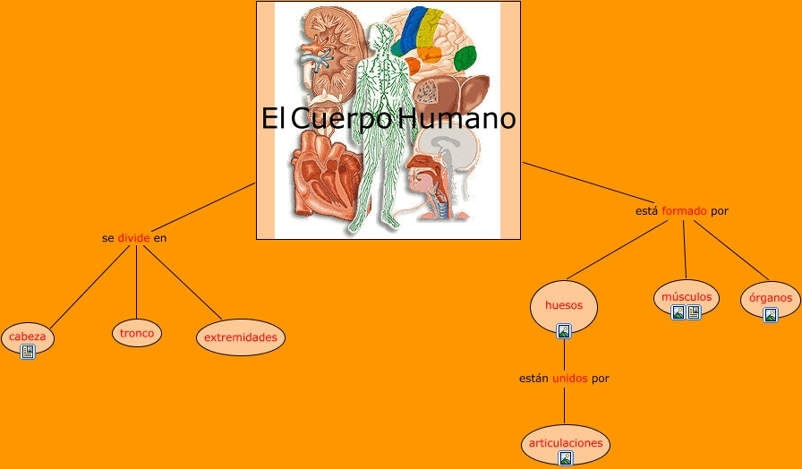 Este Cmap, tiene información relacionada con: El cuerpo humano por Esther Moreno, El Cuerpo Humano se divide en tronco, El Cuerpo Humano se divide en extremidades, El Cuerpo Humano está formado por músculos, El Cuerpo Humano se divide en cabeza, El Cuerpo Humano está formado por órganos, huesos están unidos por articulaciones, El Cuerpo Humano está formado por huesos