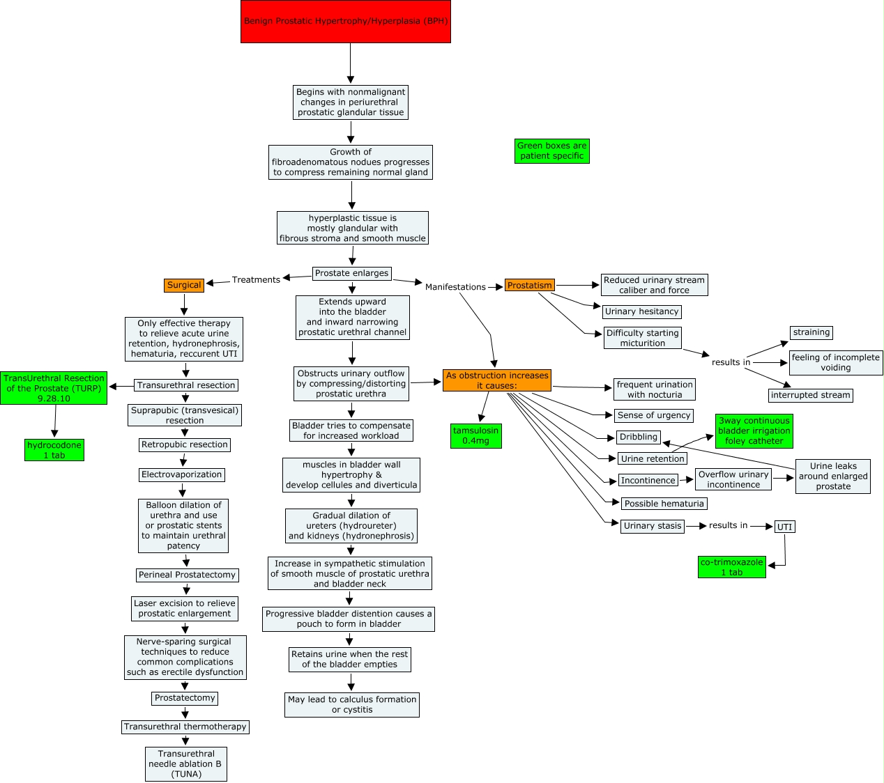 This Concept Map, created with IHMC CmapTools, has information related to: BPH, Only effective therapy to relieve acute urine retention, hydronephrosis, hematuria, reccurent UTI Transurethral resection, muscles in bladder wall hypertrophy & develop cellules and diverticula Gradual dilation of ureters (hydroureter) and kidneys (hydronephrosis), Electrovaporization Balloon dilation of urethra and use or prostatic stents to maintain urethral patency, Retropubic resection Electrovaporization, Incontinence Overflow urinary incontinence, TransUrethral Resection of the Prostate (TURP) 9.28.10 ???? hydrocodone 1 tab, As obstruction increases it causes: frequent urination with nocturia, Obstructs urinary outflow by compressing/distorting prostatic urethra As obstruction increases it causes:, Difficulty starting micturition results in feeling of incomplete voiding, Urine leaks around enlarged prostate Dribbling, Prostatectomy Transurethral thermotherapy, Prostate enlarges Extends upward into the bladder and inward narrowing prostatic urethral channel, Prostate enlarges Manifestations Prostatism, Prostatism Urinary hesitancy, Prostatism Reduced urinary stream caliber and force, As obstruction increases it causes: Incontinence, Transurethral resection Suprapubic (transvesical) resection, As obstruction increases it causes: Urine retention, Obstructs urinary outflow by compressing/distorting prostatic urethra Bladder tries to compensate for increased workload, Surgical Only effective therapy to relieve acute urine retention, hydronephrosis, hematuria, reccurent UTI