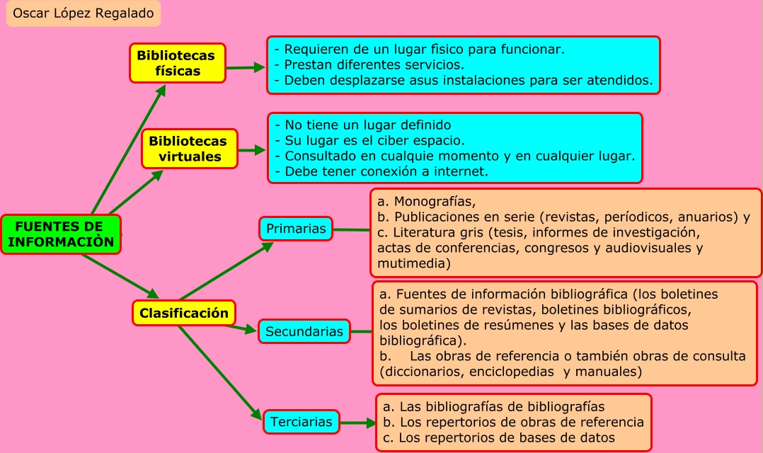 Este Cmap, tiene información relacionada con: FUENTES DE INFORMACIÓN, FUENTES DE INFORMACIÒN ???? Bibliotecas físicas, Secundarias ???? a. Fuentes de información bibliográfica (los boletines de sumarios de revistas, boletines bibliográficos, los boletines de resúmenes y las bases de datos bibliográfica). b. Las obras de referencia o también obras de consulta (diccionarios, enciclopedias y manuales), FUENTES DE INFORMACIÒN ???? Bibliotecas virtuales, FUENTES DE INFORMACIÒN ???? Clasificación, Clasificación ???? Secundarias, Terciarias ???? ????, Bibliotecas virtuales ???? - No tiene un lugar definido - Su lugar es el ciber espacio. - Consultado en cualquie momento y en cualquier lugar. - Debe tener conexión a internet., Bibliotecas físicas ???? ????, Clasificación ???? Terciarias, Clasificación ???? Primarias, Primarias ???? a. Monografías, b. Publicaciones en serie (revistas, períodicos, anuarios) y c. Literatura gris (tesis, informes de investigación, actas de conferencias, congresos y audiovisuales y mutimedia)