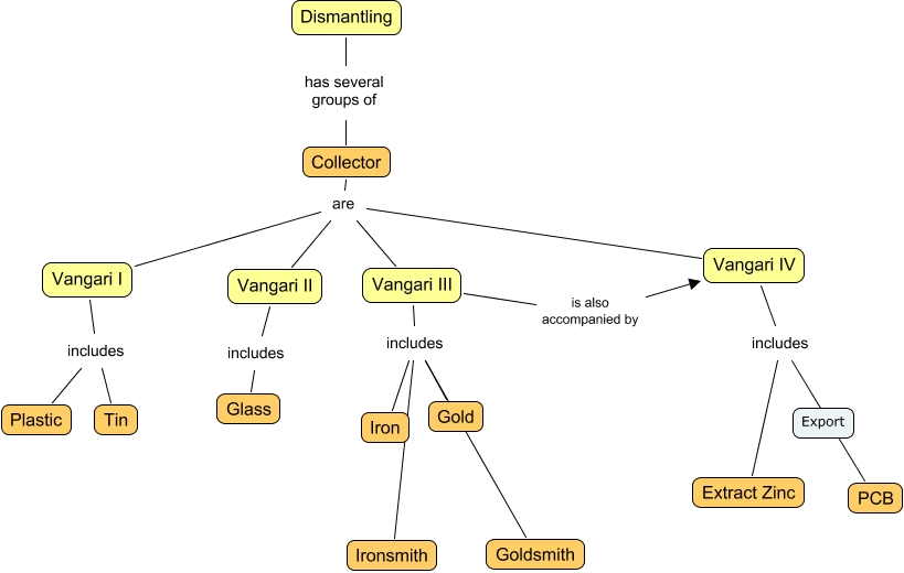 This Concept Map, created with IHMC CmapTools, has information related to: Map 2 OrganizingNAVY, Collector are Vangari III, Dismantling has several groups of Collector, Vangari I includes Tin, Vangari III includes Iron, Vangari III includes Goldsmith, Vangari II includes Glass, Vangari IV includes Extract Zinc, Vangari I includes Plastic, Vangari III includes Ironsmith, Collector are Vangari I, Collector are Vangari IV, Vangari IV includes PCB, Collector are Vangari II, Vangari III is also accompanied by Vangari IV, Vangari III includes Gold