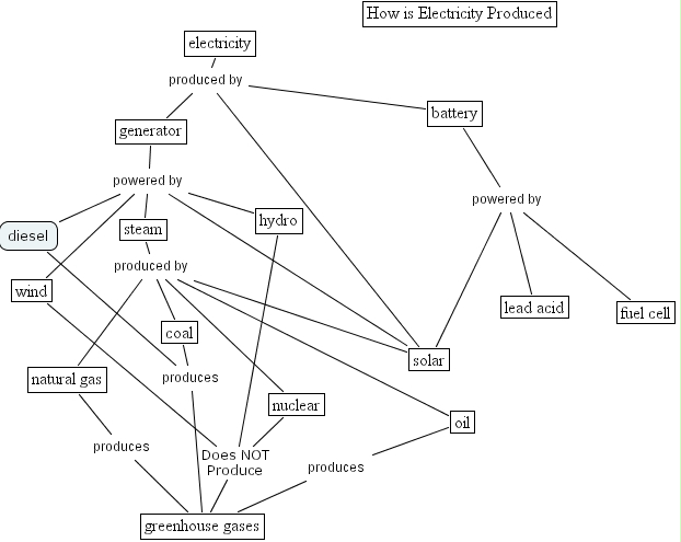 wind Does NOT Produce greenhouse gases, nuclear Does NOT Produce greenhouse gases, coal produces greenhouse gases, diesel produces greenhouse gases, natural gas produces greenhouse gases, steam produced by nuclear, steam produced by natural gas, steam produced by solar, steam produced by oil, steam produced by coal, battery powered by lead acid, battery powered by fuel cell, battery powered by solar, electricity produced by battery, electricity produced by generator, electricity produced by solar, generator powered by diesel, generator powered by steam, generator powered by wind, generator powered by solar, generator powered by hydro, oil produces greenhouse gases, hydro Does NOT Produce greenhouse gases
