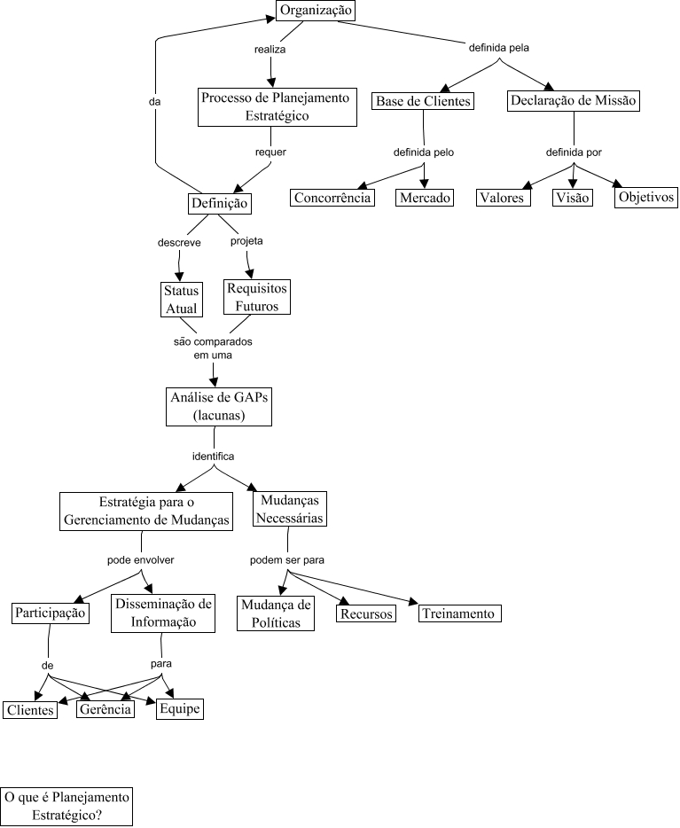 Esse mapa conceitual, produzido no IHMC CmapTools, tem a informação relacionada a: Strategic planningv2, Mudanças Necessárias podem ser para Mudança de Políticas, Participação de Clientes, Status Atual são comparados em uma Análise de GAPs (lacunas), Processo de Planejamento Estratégico requer Definição, Definição da Organização, Participação de Gerência, Participação de Equipe, Mudanças Necessárias podem ser para Treinamento, Análise de GAPs (lacunas) identifica Mudanças Necessárias, Mudanças Necessárias podem ser para Recursos, Organização definida pela Base de Clientes, Declaração de Missão definida por Visão, Estratégia para o Gerenciamento de Mudanças pode envolver Participação, Base de Clientes definida pelo Concorrência, Disseminação de Informação para Gerência, Disseminação de Informação para Clientes, Base de Clientes definida pelo Mercado, Definição projeta Requisitos Futuros, Declaração de Missão definida por Valores, Organização definida pela Declaração de Missão