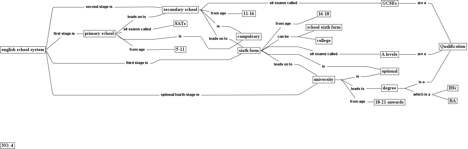 04, compulsary, qualification, school sixth form, gcses, sixth form, sats, secondary school, college, 5-11, ba, optional, university, 11-16, degree, bsc, a levels, no. 4, primary school, 18-21 onwards, english school system, 16-18