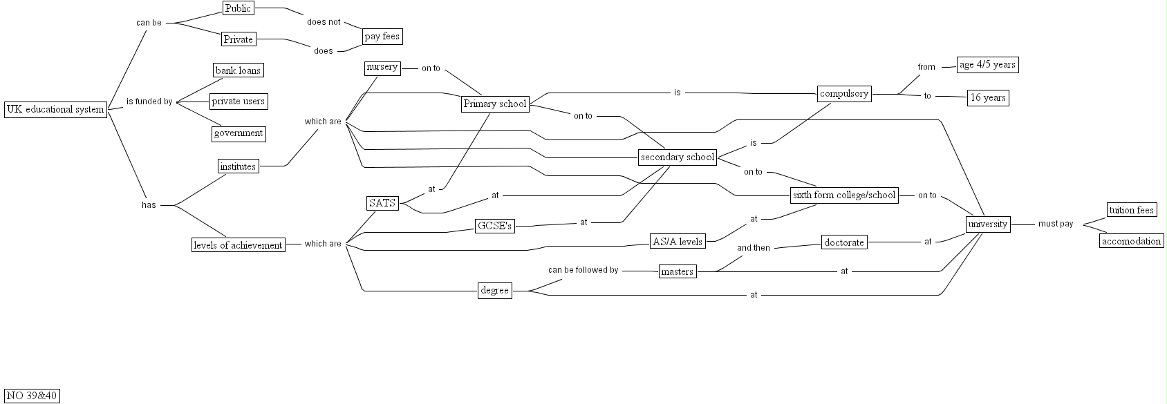 39&40, sats, 16 years, sixth form college school, gcse's, university, private, private users, tuition fees, degree, uk educational system, bank loans, primary school, government, no 39&40, secondary school, pay fees, levels of achievement, age 4 5 years, as a levels, nursery, compulsory, masters, institutes, accomodation, public, doctorate