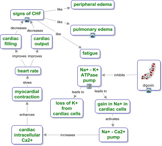 This Concept Map, created with IHMC CmapTools, has information related to: digoxincmap, Na+ - K+ ATPase pump leads to gain in Na+ in cardiac cells, signs of CHF like pulmonary edema, signs of CHF like fatigue, Na+ - Ca2+ pump increases cardiac intracellular Ca2+, cardiac output decreases signs of CHF, Na+ - K+ ATPase pump leads to loss of K+ from cardiac cells, cardiac filling decreases signs of CHF, heart rate improves cardiac filling, myocardial contraction slows heart rate, signs of CHF like peripheral edema, inhibits Na+ - K+ ATPase pump, gain in Na+ in cardiac cells activates Na+ - Ca2+ pump, heart rate improves cardiac output, cardiac intracellular Ca2+ enhances myocardial contraction