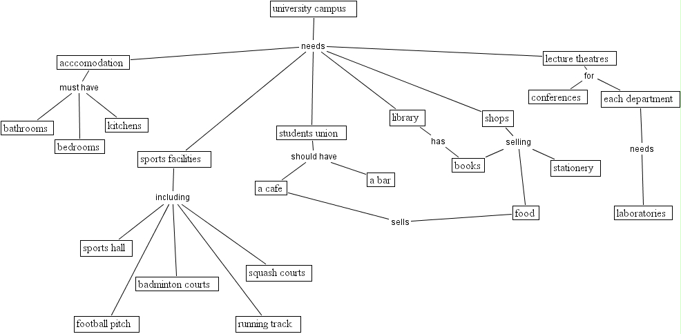 no 20, sports hall, acccomodation, students union, running track, sports facilities, kitchens, books, bedrooms, a bar, lecture theatres, conferences, bathrooms, badminton courts, stationery, laboratories, library, food, shops, university campus, squash courts, football pitch, each department, a cafe