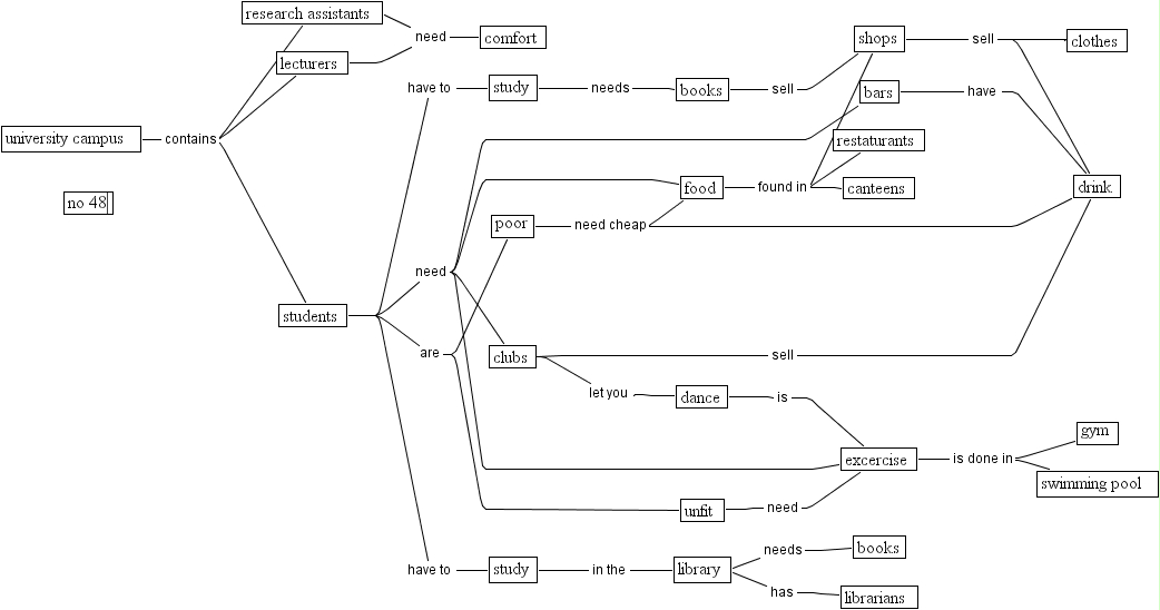 no 48, no 48, bars, canteens, excercise, study, study, librarians, food, restaturants, clothes, books, research assistants, university campus, unfit, lecturers, shops, students, clubs, swimming pool, gym, drink, poor, dance, books, comfort, library