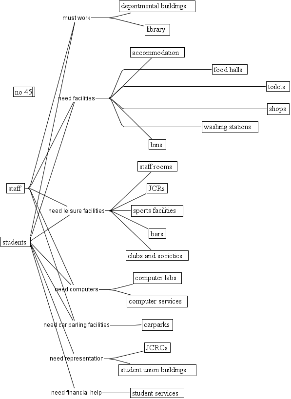no 45, computer services, bars, no 45, library, bins, staff rooms, clubs and societies, shops, accommodation, departmental buildings, jcrcs, staff, sports facilities, jcrs, student services, food halls, carparks, washing stations, students, student union buildings, computer labs, toilets
