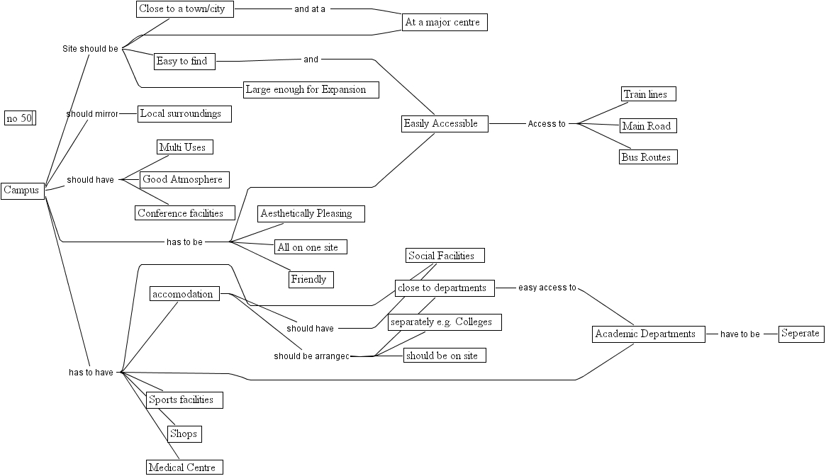 no 50, seperate, accomodation, sports facilities, friendly, large enough for expansion, social facilities, shops, main road, medical centre, at a major centre, bus routes, academic departments, should be on site, close to a town city, multi uses, easy to find, all on one site, close to departments, easily accessible, train lines, good atmosphere, local surroundings, conference facilities, separately e.g. colleges, no 50, campus, aesthetically pleasing