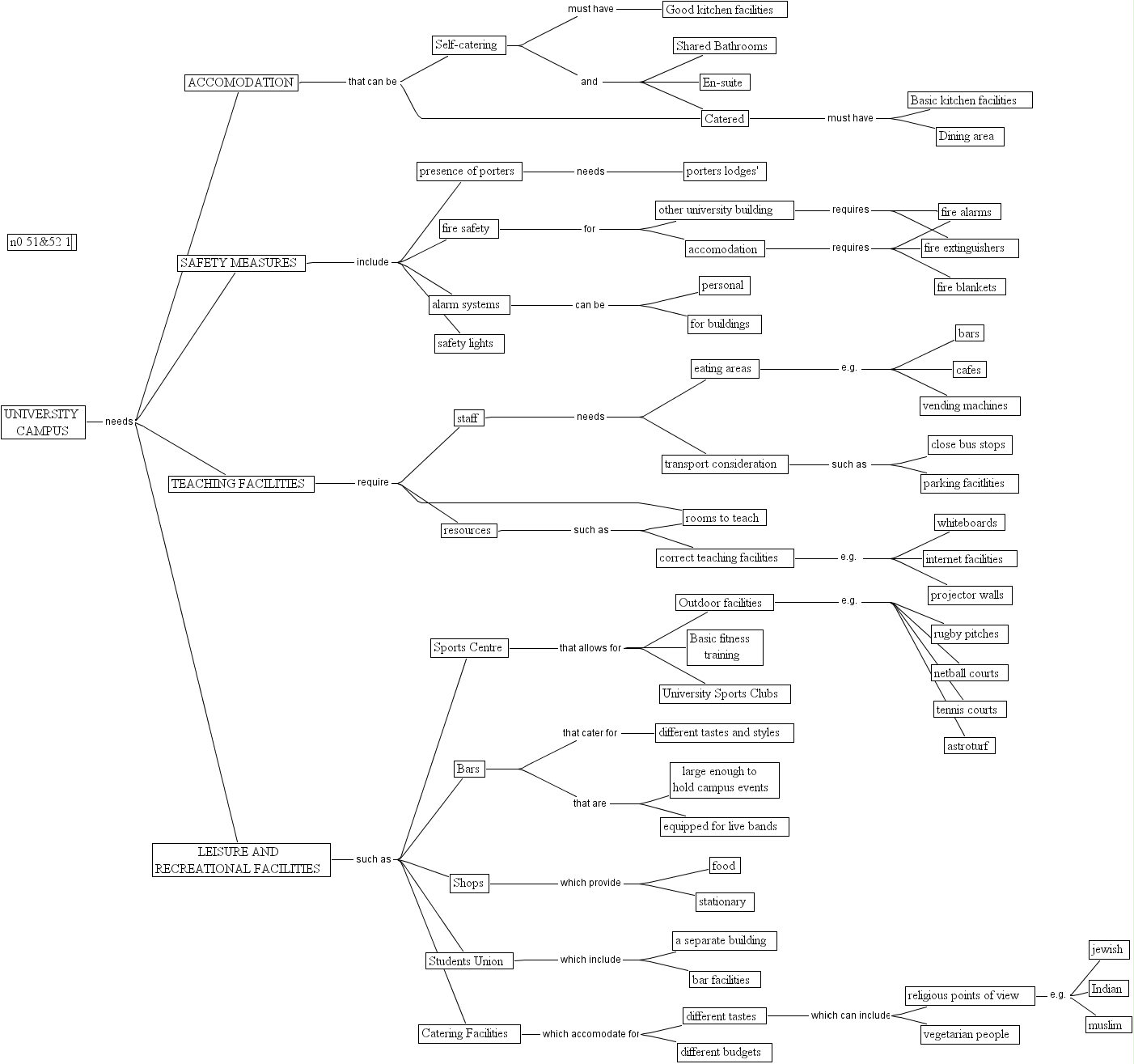 no 51 &52 1, resources, different tastes, n0 51&52 1, good kitchen facilities, transport consideration, leisure and recreational facilities, equipped for live bands, astroturf, safety measures, close bus stops, porters lodges', catering facilities, dining area, accomodation, university sports clubs, vending machines, large enough to hold campus events, sports centre, eating areas, students union, different tastes and styles, different budgets, internet facilities, fire extinguishers, bar facilities, catered, basic kitchen facilities, staff, presence of porters, outdoor facilities, parking facitlities, netball courts, muslim, tennis courts, stationary, bars, food, personal, safety lights, bars, whiteboards, a separate building, projector walls, shared bathrooms, rugby pitches, basic fitness training, cafes, other university building , self-catering, fire blankets, shops, fire alarms, en-suite, indian, for buildings, correct teaching facilities, jewish, fire safety, alarm systems, university campus, teaching facilities, religious points of view, vegetarian people, accomodation, rooms to teach
