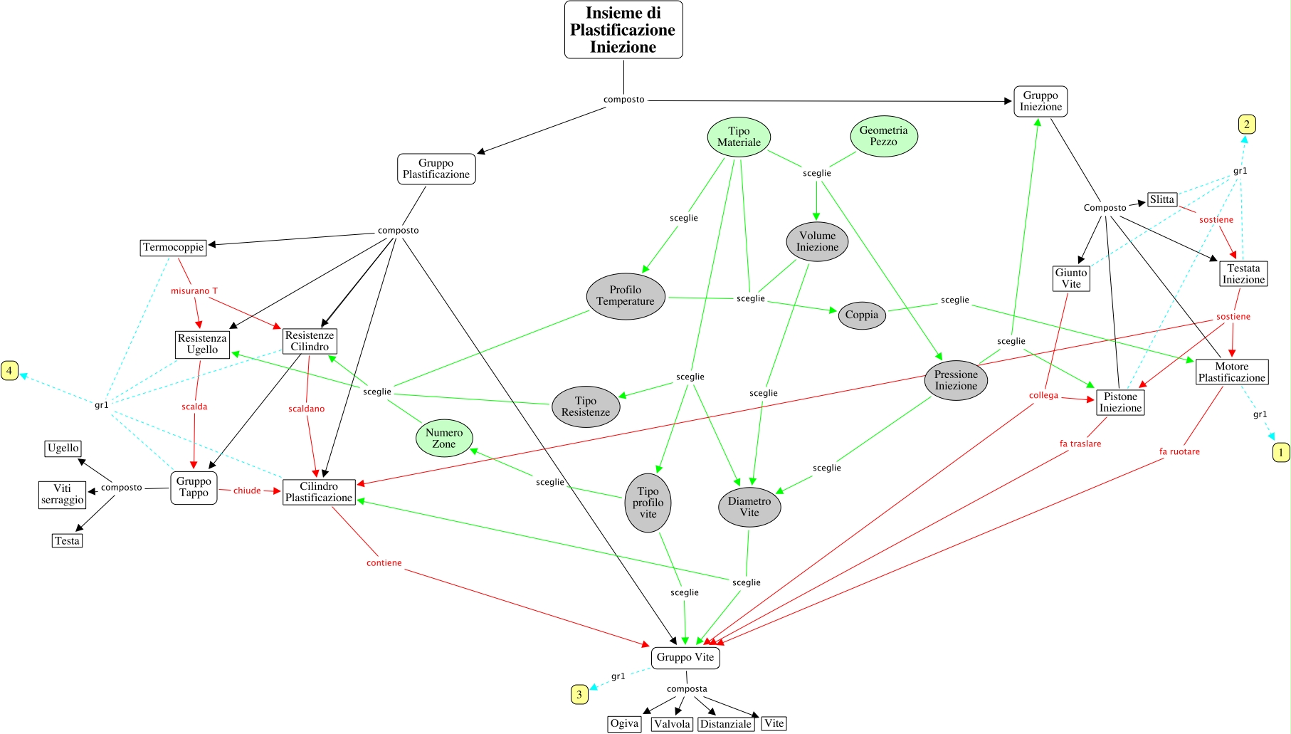 This Concept Map, created with IHMC CmapTools, has information related to: Insieme di plastificazione_iniezione, Resistenze Cilindro scaldano Cilindro Plastificazione, Pressione Iniezione sceglie Gruppo Iniezione, Pistone Iniezione gr1 2, Tipo Materiale sceglie Tipo Resistenze, Coppia sceglie Motore Plastificazione, Gruppo Iniezione Composto Slitta, Tipo Materiale sceglie Profilo Temperature, Volume Iniezione sceglie Coppia, Diametro Vite sceglie Cilindro Plastificazione, Testata Iniezione sostiene Pistone Iniezione, Motore Plastificazione Composto Testata Iniezione, Tipo Materiale sceglie Volume Iniezione, Tipo Materiale sceglie Coppia, Insieme di Plastificazione Iniezione composto Gruppo Plastificazione, Motore Plastificazione gr1 1, Gruppo Plastificazione composto Cilindro Plastificazione, Pistone Iniezione fa traslare Gruppo Vite, Gruppo Vite gr1 3, Giunto Vite gr1 2, Pressione Iniezione sceglie Diametro Vite