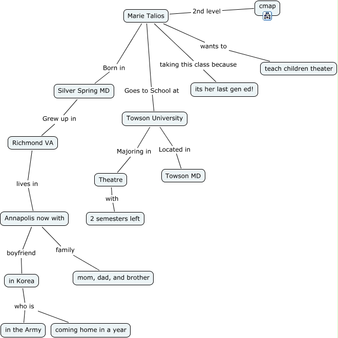 This Concept Map, created with IHMC CmapTools, has information related to: Marie Talios, Marie Talios Goes to School at Towson University, Marie Talios taking this class because its her last gen ed!, Marie Talios Born in Silver Spring MD, in Korea who is in the Army, Theatre with 2 semesters left, Towson University Located in Towson MD, Richmond VA lives in Annapolis now with, Silver Spring MD Grew up in Richmond VA, Marie Talios wants to teach children theater, Marie Talios 2nd level cmap, Annapolis now with family mom, dad, and brother, in Korea who is coming home in a year, Annapolis now with boyfriend in Korea, Towson University Majoring in Theatre