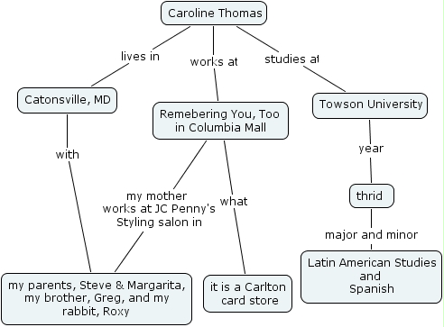 introduction, catonsville, md, my parents, steve & margarita, my brother, greg, and my rabbit, roxy, latin american studies and spanish, towson university, caroline thomas, it is a carlton card store, thrid , remebering you, too in columbia mall