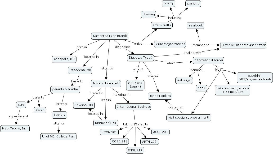 samantha brandt-information page, u. of md, college park, richmond hall, econ 201, international business, poetry, arth 107, towson university, arts & crafts, painting, johns hopkins, eat sugar, yearbook, annapolis, md, samantha lynn brandt, pasadena, md, eat drink diet sugar-free foods, visit specialist once a month, cosc 311, diabetes type i, pancreatic disorder, drink, acct 201, oct. 1987 (age 4), juvenile diabetes association, clubs organizations, engl 317, parents & brother, towson, md, mack trucks, inc., kurt, karen, drawing, take insulin injections 4-6 times day, zachary