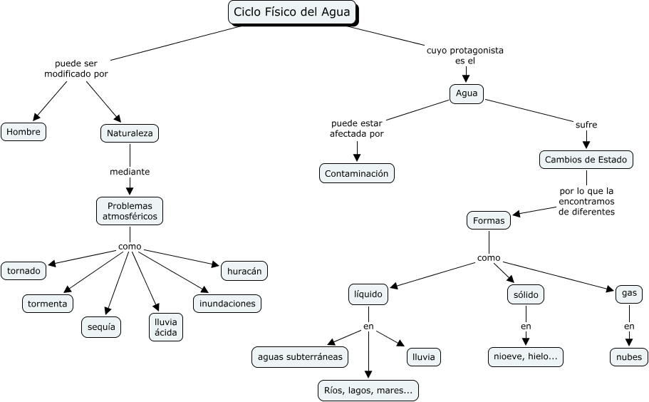 Este Cmap, tiene información relacionada con: ciclo del agua, Formas como sólido, Problemas atmosféricos como tornado, líquido en aguas subterráneas, líquido en lluvia, líquido en Ríos, lagos, mares..., Problemas atmosféricos como inundaciones, Agua sufre Cambios de Estado, Naturaleza mediante Problemas atmosféricos, Problemas atmosféricos como sequía, Cambios de Estado por lo que la encontramos de diferentes Formas, gas en nubes, sólido en nioeve, hielo..., Ciclo Físico del Agua cuyo protagonista es el Agua, Ciclo Físico del Agua puede ser modificado por Naturaleza, Problemas atmosféricos como tormenta, Ciclo Físico del Agua puede ser modificado por Hombre, Formas como gas, Problemas atmosféricos como huracán, Problemas atmosféricos como lluvia ácida, Formas como líquido