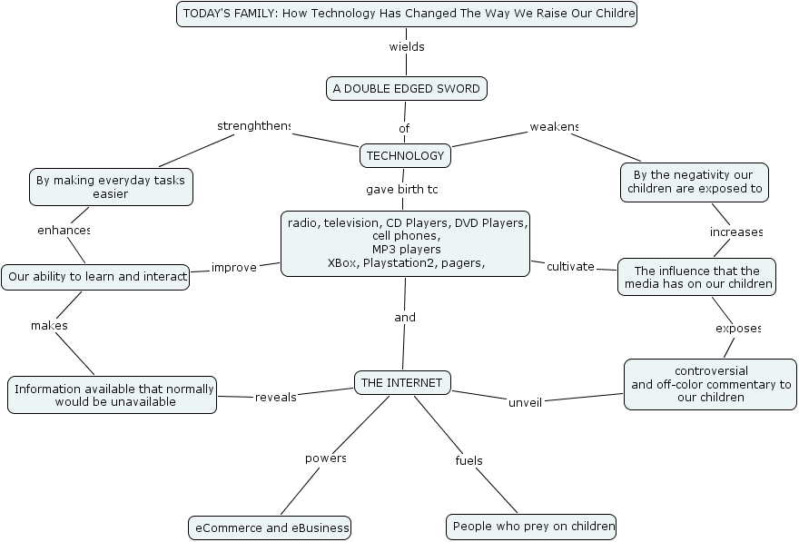 the way we raise our children, our ability to learn and interact, controversial and off-color commentary to our children, ecommerce and ebusiness, information available that normally would be unavailable, technology, the internet, the influence that the media has on our children, radio, television, cd players, dvd players, cell phones, mp3 players xbox, playstation2, pagers, , by making everyday tasks easier , today's family how technology has changed the way we raise our children, a double edged sword, people who prey on children, by the negativity our children are exposed to
