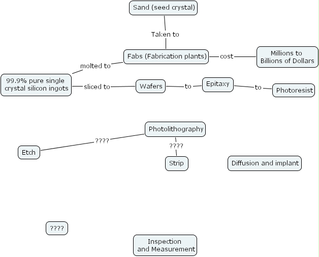 chip fabrication, epitaxy, millions to billions of dollars, sand (seed crystal), photolithography, wafers, 99.9% pure single crystal silicon ingots, etch, diffusion and implant, strip, ????, fabs (fabrication plants), inspection and measurement, photoresist