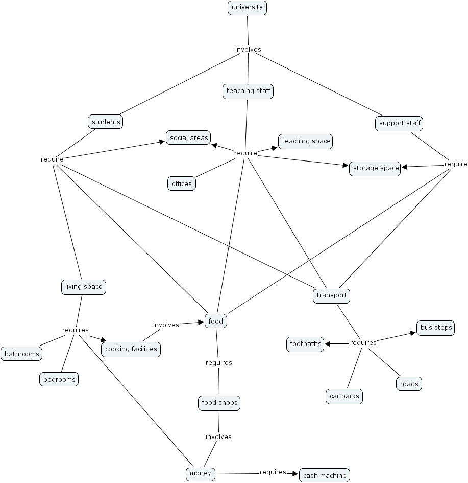 no 09, teaching space, storage space, cash machine, support staff, social areas, money, offices, bedrooms, footpaths, bus stops, living space, transport, university, teaching staff, bathrooms, roads, food shops, cooking facilities, food, car parks, students