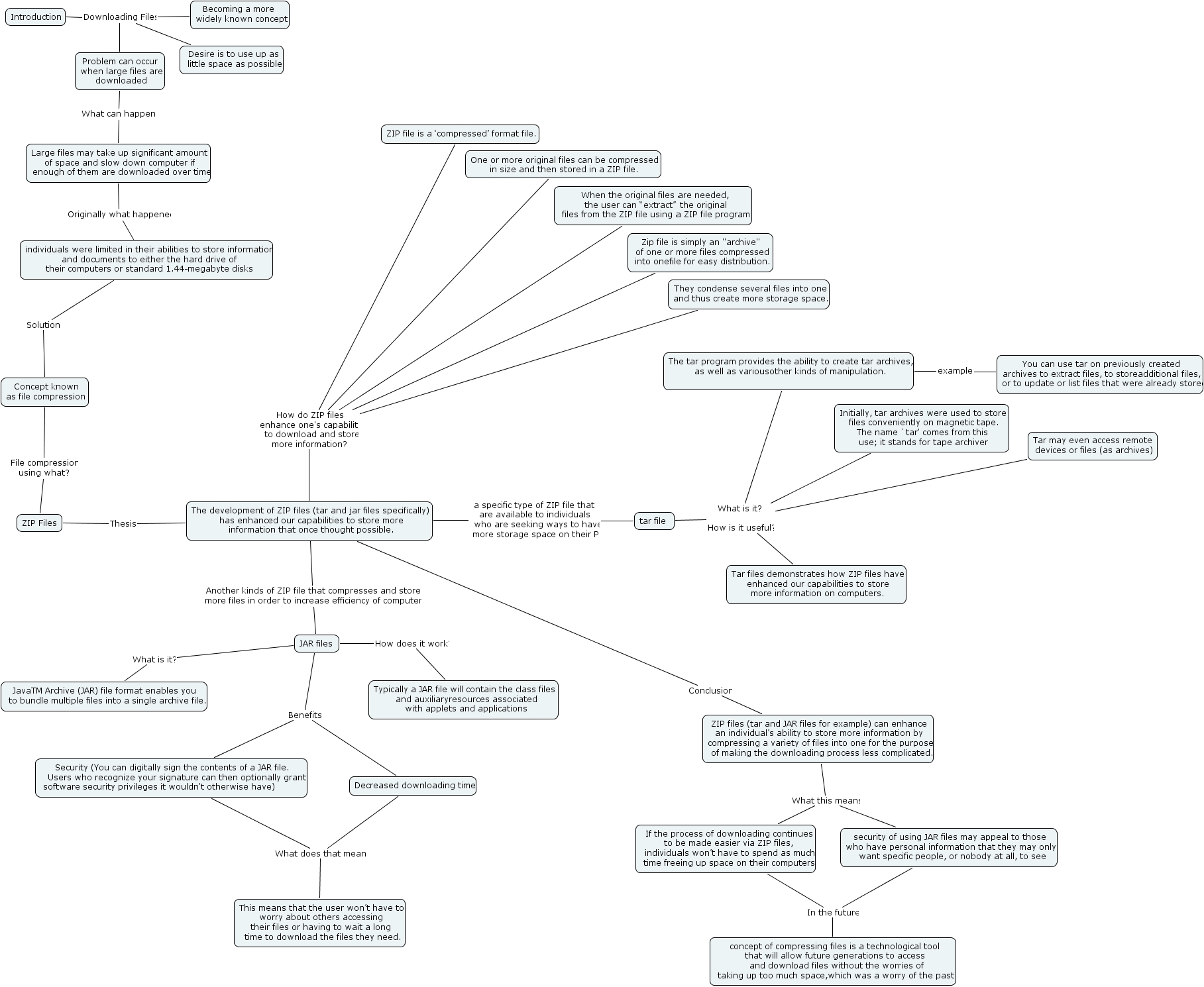 reading cmap, when the original files are needed, the user can �extract� the original files from the zip file using a zip file program, zip files (tar and jar files for example) can enhance an individual�s ability to store more information by compressing a variety of files into one for the purpose of making the downloading process less complicated., one or more original files can be compressed in size and then stored in a zip file. , initially, tar archives were used to store files conveniently on magnetic tape. the name `tar' comes from this use it stands for tape archiver, jar files, tar files demonstrates how zip files have enhanced our capabilities to store more information on computers., large files may take up significant amount of space and slow down computer if enough of them are downloaded over time, decreased downloading time, security (you can digitally sign the contents of a jar file. users who recognize your signature can then optionally grant software security privileges it wouldn't otherwise have) , zip file is simply an archive of one or more files compressed into onefile for easy distribution., tar file , you can use tar on previously created archives to extract files, to storeadditional files, or to update or list files that were already stored, security of using jar files may appeal to those who have personal information that they may only want specific people, or nobody at all, to see, desire is to use up as little space as possible, this means that the user won�t have to worry about others accessing their files or having to wait a long time to download the files they need., the development of zip files (tar and jar files specifically) has enhanced our capabilities to store more information that once thought possible. , zip file is a �compressed� format file., typically a jar file will contain the class files and auxiliaryresources associated with applets and applications, tar may even access remote devices or files (as archives), if the process of downloading continues to be made easier via zip files, individuals won�t have to spend as much time freeing up space on their computers, introduction, zip files, the tar program provides the ability to create tar archives, as well as variousother kinds of manipulation. , individuals were limited in their abilities to store information and documents to either the hard drive of their computers or standard 1.44-megabyte disks, problem can occur when large files are downloaded, becoming a more widely known concept, concept of compressing files is a technological tool that will allow future generations to access and download files without the worries of taking up too much space,which was a worry of the past. , javatm archive (jar) file format enables you to bundle multiple files into a single archive file., concept known as file compression, they condense several files into one and thus create more storage space.