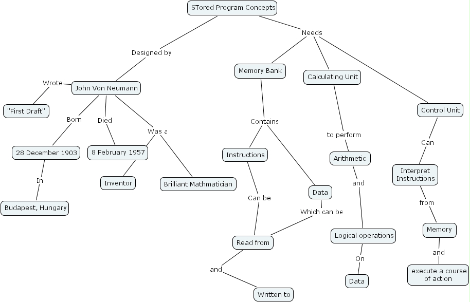 stored program concepts, 28 december 1903, 8 february 1957, inventor, calculating unit, brilliant mathmatician, instructions, execute a course of action, written to, stored program concepts, logical operations, data, data, memory bank, arithmetic, read from, control unit, budapest, hungary, john von neumann, memory, interpret instructions, first draft