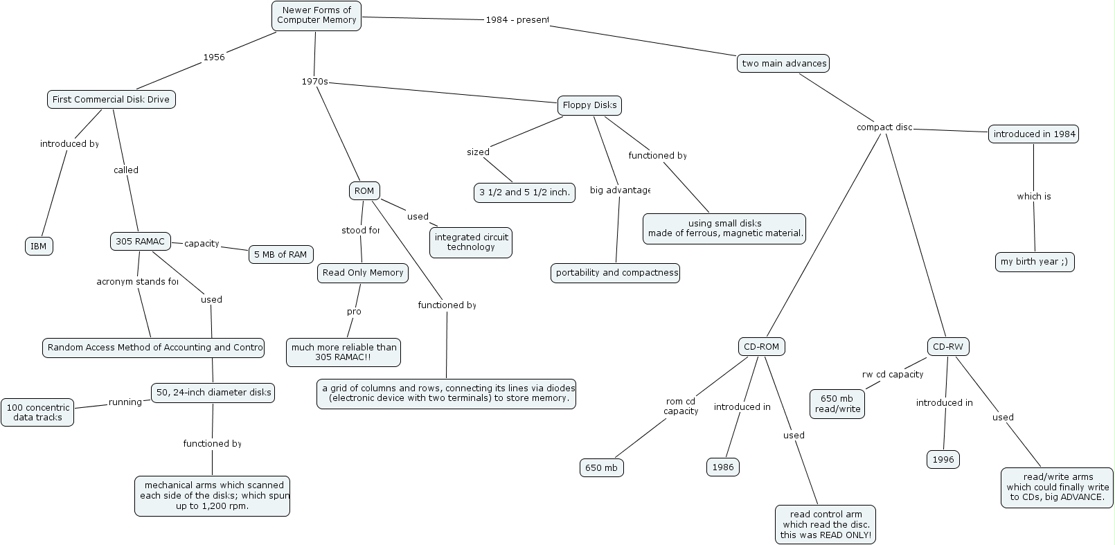 historymemory2, random access method of accounting and control, rom, read control arm which read the disc. this was read only!, two main advances, mechanical arms which scanned each side of the disks which spun up to 1,200 rpm., 5 mb of ram, 1986, much more reliable than 305 ramac!!, ibm, cd-rw, 3 1 2 and 5 1 2 inch., 650 mb read write, portability and compactness, my birth year ), floppy disks, 305 ramac, read write arms which could finally write to cds, big advance., 100 concentric data tracks, a grid of columns and rows, connecting its lines via diodes (electronic device with two terminals) to store memory., 50, 24-inch diameter disks, first commercial disk drive, introduced in 1984, using small disks made of ferrous, magnetic material., read only memory, 1996, integrated circuit technology, 650 mb, cd-rom, newer forms of computer memory