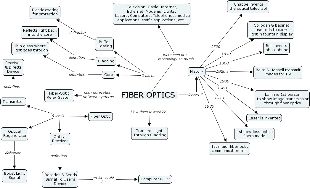cmap 4 report2(fiberoptics), transmit light through cladding, optical regenerator, cladding, laser is invented, computer & t.v, transmitter, boost light signal, fiber optic, collodan & babinet use rods to carry light in fountain display, lamn is 1st person to show image transmission through fiber optics, buffer coating, chappe invents the optical telegraph, 1st major fiber optic communication link, thin glass where light goes through, core, bell invents photophone, fiber optics, decodes & sends signal to user's device, fiber-optic relay system, receives & directs device, television, cable, internet, ethernet, modems, lights, lasers, computers, telephones, medical applications, traffic applications, etc..., baird & hansell transmit images for t.v, plastic coating for protection, reflects light back into the core, history, optical receiver, 1st low-loss optical fibers made