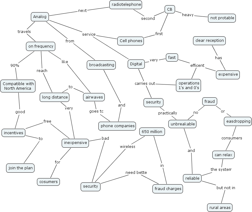 analog vs.digital, cell phones, join the plan, incentives, fraud charges, analog, fast, unbreakable, broadcasting, digital, airwaves, radiotelephone, phone companies, operations 1's and 0's, not protable, clear reception, long distance, expensive, can relax, security, cosumers, inexpensive, on frequency, rural areas, security, easdropping, 650 million, fraud, compatible with north america, reliable, cb