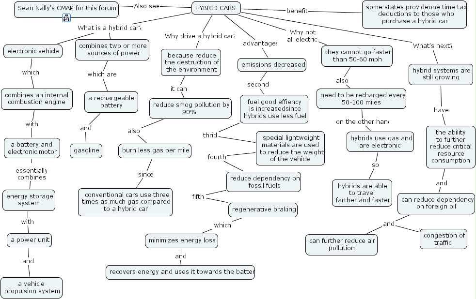 hybrid cars, burn less gas per mile, electronic vehicle, combines two or more sources of power, a vehicle propulsion system, can reduce dependency on foreign oil, recovers energy and uses it towards the battery, because reduce the destruction of the environment, hybrid systems are still growing, a power unit, hybrid cars, reduce smog pollution by 90% , a battery and electronic motor, energy storage system, hybrids are able to travel farther and faster, gasoline, they cannot go faster than 50-60 mph, the ability to further reduce critical resource consumption, minimizes energy loss, can further reduce air pollution, sean nally's cmap for this forum, a rechargeable battery, hybrids use gas and are electronic , need to be recharged every 50-100 miles, congestion of traffic, reduce dependency on fossil fuels, emissions decreased, fuel good effiency is increasedsince hybrids use less fuel, some states provideone time tax deductions to those who purchase a hybrid car, combines an internal combustion engine , special lightweight materials are used to reduce the weight of the vehicle, regenerative braking, conventional cars use three times as much gas compared to a hybrid car