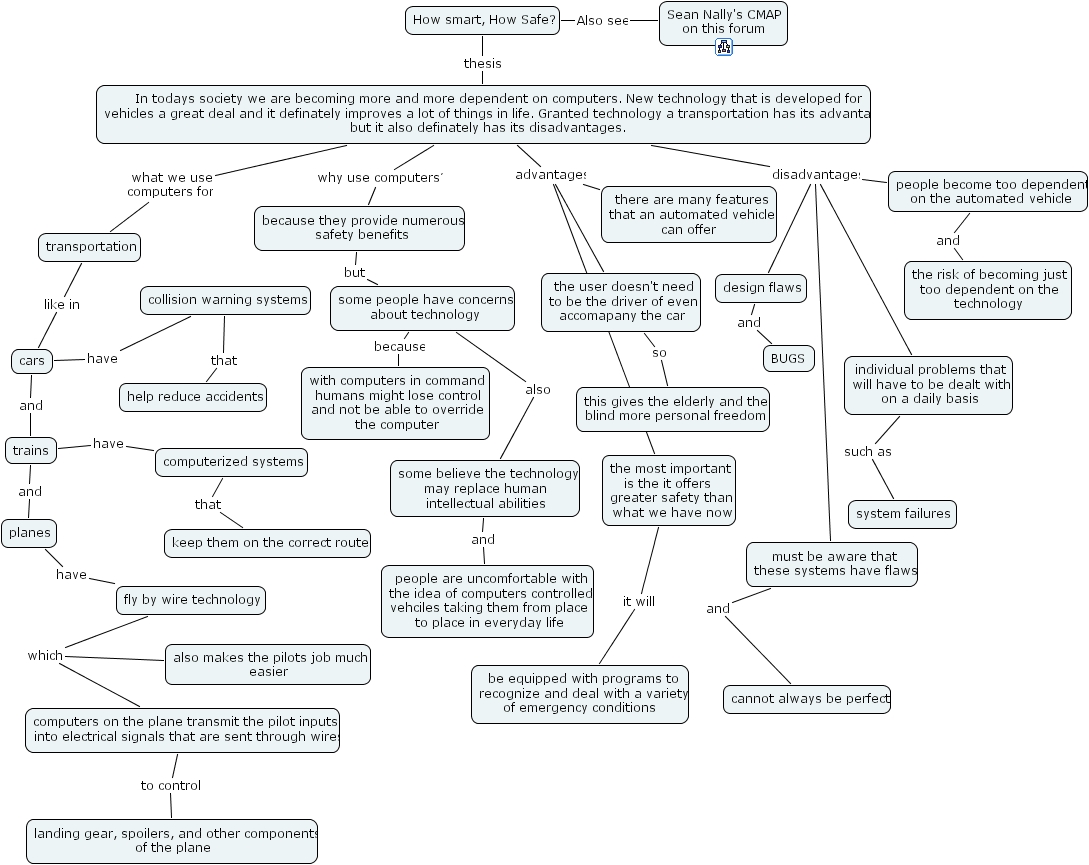 how smart how safe, also makes the pilots job much easier, there are many features that an automated vehicle can offer, be equipped with programs to recognize and deal with a variety of emergency conditions , cars, because they provide numerous safety benefits, sean nally's cmap on this forum, cannot always be perfect, the risk of becoming just too dependent on the technology, landing gear, spoilers, and other components of the plane, system failures, the user doesn't need to be the driver of even accomapany the car, this gives the elderly and the blind more personal freedom, people are uncomfortable with the idea of computers controlled vehciles taking them from place to place in everyday life, computers on the plane transmit the pilot inputs into electrical signals that are sent through wires, people become too dependent on the automated vehicle, bugs, in todays society we are becoming more and more dependent on computers. new technology that is developed for vehicles a great deal and it definately improves a lot of things in life. granted technology a transportation has its advantages but it also definately has its disadvantages. , help reduce accidents, design flaws, trains, transportation, some people have concerns about technology , how smart, how safe?, fly by wire technology, computerized systems, the most important is the it offers greater safety than what we have now, individual problems that will have to be dealt with on a daily basis, planes, keep them on the correct route, some believe the technology may replace human intellectual abilities, must be aware that these systems have flaws, collision warning systems, with computers in command humans might lose control and not be able to override the computer