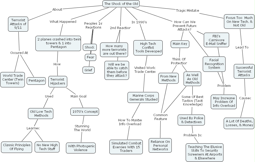 readings report cmap, with photogenic violence, as well as old methods, terrorist attacks of 9 11, marine corps generals studied, focus too much on new tech. & not old, grief, facial recognition system, no new high tech stuff, classic principles of flying, will we be able to catch them before they attack?, shock, 2 planes crashed into twin towers & 1 into pentagon, old low tech methods, used by police & detectives, fbi's carnivore e-mail sniffer, successful terrorist attacks, world trade center (twin towers), high tech conflict tools deveoped, from new methods, main key, may increase problem of info overload, simulated combat exercies with 15 traders, terrorist hijackers, a lot of deaths, losses, & money, how many more terrorists are out there?, the shock of the old, pentagon, teaching the elusive skills to security screeners at airports & elsewhere, reliance on personal networks, fear, 1970's concept