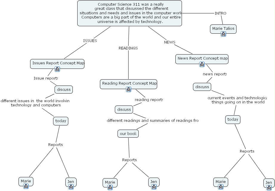 lastone, marie, marie, discuss, today, news report concept map, our book, jen, jen, today, computer science 311 was a really great class that discussed the different situations and needs and issues in the computer world. computers are a big part of the world and our entire universe is affected by technology. , jen, marie talios, discuss, issues report concept map, discuss, marie, reading report concept map
