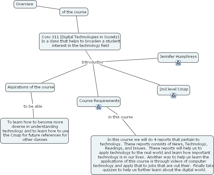 final cmap, in this course we will do 4 reports that pertain to technology. these reports consists of news, technology, readings, and issues. these reports will help us to apply technology to the real world and learn how important technology is in our lives. another way to help us learn the applications of this course is through videos of computer technology and apply that to jobs that are out their. finally take quizzes to help us further learn about the digital world., cosc 311 (digital technologies in society) is a class that helps to broaden a students interest in the technology field, overview , of the course, 2nd level cmap, to learn how to become more diverse in understanding technology and to learn how to use the cmap for future references for other classes, aspirations of the course, course requirements, jennifer humphreys