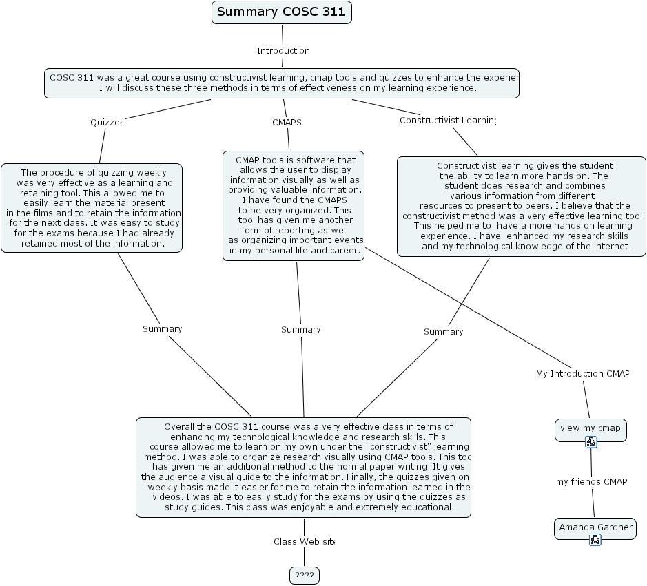 project 5, cosc 311 was a great course using constructivist learning, cmap tools and quizzes to enhance the experience. i will discuss these three methods in terms of effectiveness on my learning experience., the procedure of quizzing weekly was very effective as a learning and retaining tool. this allowed me to easily learn the material present in the films and to retain the information for the next class. it was easy to study for the exams because i had already retained most of the information., ????, cmap tools is software that allows the user to display information visually as well as providing valuable information. i have found the cmaps to be very organized. this tool has given me another form of reporting as well as organizing important events in my personal life and career., overall the cosc 311 course was a very effective class in terms of enhancing my technological knowledge and research skills. this course allowed me to learn on my own under the constructivist learning method. i was able to organize research visually using cmap tools. this tool has given me an additional method to the normal paper writing. it gives the audience a visual guide to the information. finally, the quizzes given on a weekly basis made it easier for me to retain the information learned in the videos. i was able to easily study for the exams by using the quizzes as study guides. this class was enjoyable and extremely educational., summary cosc 311, ????, constructivist learning gives the student the ability to learn more hands on. the student does research and combines various information from different resources to present to peers. i believe that the constructivist method was a very effective learning tool. this helped me to have a more hands on learning experience. i have enhanced my research skills and my technological knowledge of the internet., view my cmap, amanda gardner