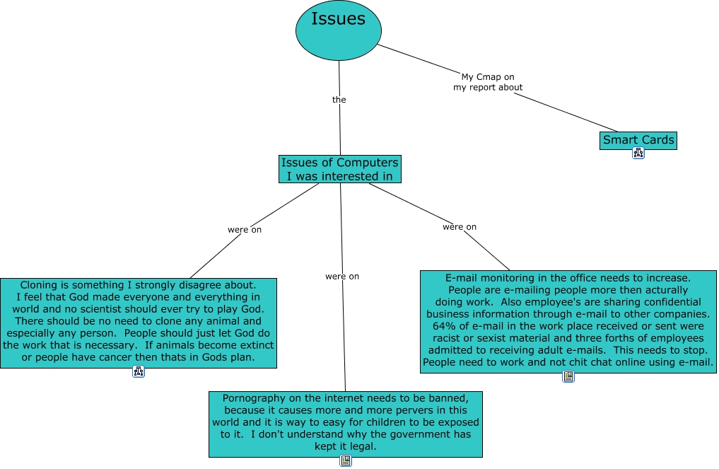 Este Cmap, tiene información relacionada con: Issues Summary, Issues of Computers I was interested in were on Pornography on the internet needs to be banned, because it causes more and more pervers in this world and it is way to easy for children to be exposed to it. I don't understand why the government has kept it legal., Issues the Issues of Computers I was interested in, Issues of Computers I was interested in were on Cloning is something I strongly disagree about. I feel that God made everyone and everything in world and no scientist should ever try to play God. There should be no need to clone any animal and especially any person. People should just let God do the work that is necessary. If animals become extinct or people have cancer then thats in Gods plan., Issues My Cmap on my report about Smart Cards, Issues of Computers I was interested in were on E-mail monitoring in the office needs to increase. People are e-mailing people more then acturally doing work. Also employee's are sharing confidential business information through e-mail to other companies. 64% of e-mail in the work place received or sent were racist or sexist material and three forths of employees admitted to receiving adult e-mails. This needs to stop. People need to work and not chit chat online using e-mail.