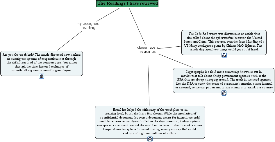 readings second level, email has helped the efficiency of the workplace to an amazing level, but it also has a few thorns. while the circulation of a confidential document (or even a document meant for internal use only) could have been resonably controlled in the days pre-email, today's systems can spread a document around the world in the time it takes to click a mouse. corporations today have to avoid making an easy misstep that could end up costing them millions of dollars., the readings i have reviewed, cryptography is a field most commonly known about in movies that talk about 'shady government agencies' such as the nsa that are always snooping around. the truth is, we need agencies like the nsa to crack the codes of our nation's enemies, either internal or external, so we can put an end to any attempts to attack our country., are you the weak link? the article discussed how hackers are enterig the systems of corporations not through the default method of the computer line, but rather through the time-honored technique of smooth talking new or unwitting employees, the code red worm was discussed in an article that also talked about the cyberwarfare between the united states and china. this occured over the forced landing of a us navy intelligence plane by chinese mig fighters. this article displayed how things could get out of hand.