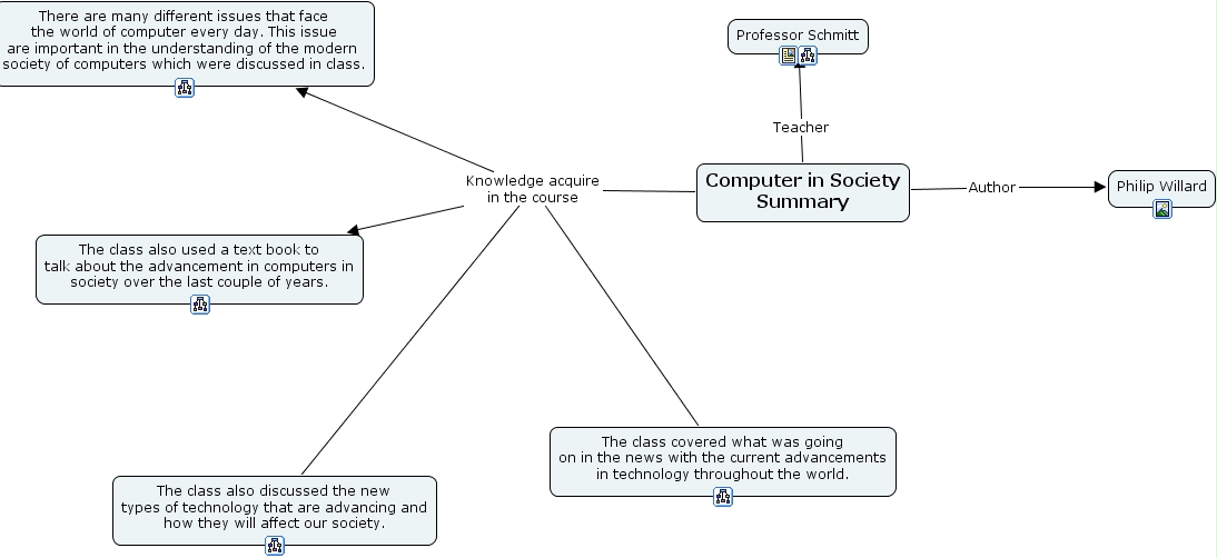 1, philip willard, the class covered what was going on in the news with the current advancements in technology throughout the world., computer in society summary, the class also discussed the new types of technology that are advancing and how they will affect our society., professor schmitt, the class also used a text book to talk about the advancement in computers in society over the last couple of years., there are many different issues that face the world of computer every day. this issue are important in the understanding of the modern society of computers which were discussed in class.