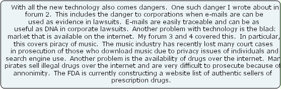 dangers, with all the new technology also comes dangers. one such danger i wrote about in forum 2. this includes the danger to corporations when e-mails are can be used as evidence in lawsuits. e-mails are easily traceable and can be as useful as dna in corporate lawsuits. another problem with technology is the black market that is available on the internet. my forum 3 and 4 covered this. in particular, this covers piracy of music. the music industry has recently lost many court cases in prosecution of those who download music due to privacy issues of individuals and search engine use. another problem is the availability of drugs over the internet. many pirates sell illegal drugs over the internet and are very difficult to prosecute because of a annonimity. the fda is currently constructing a website list of authentic sellers of prescription drugs.