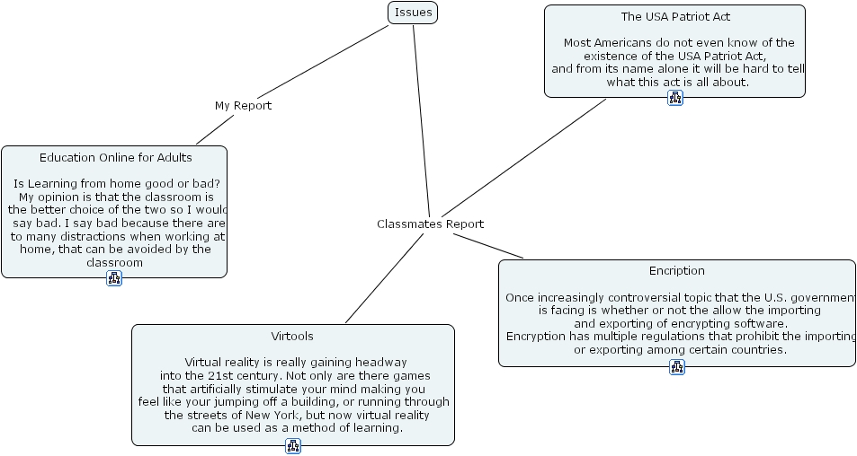issues, the usa patriot act most americans do not even know of the existence of the usa patriot act, and from its name alone it will be hard to tell what this act is all about., education online for adults is learning from home good or bad? my opinion is that the classroom is the better choice of the two so i would say bad. i say bad because there are to many distractions when working at home, that can be avoided by the classroom, issues, virtools virtual reality is really gaining headway into the 21st century. not only are there games that artificially stimulate your mind making you feel like your jumping off a building, or running through the streets of new york, but now virtual reality can be used as a method of learning., encription once increasingly controversial topic that the u.s. government is facing is whether or not the allow the importing and exporting of encrypting software. encryption has multiple regulations that prohibit the importing or exporting among certain countries.
