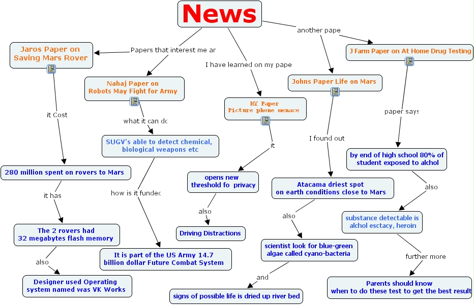 news, sugv's able to detect chemical, biological weapons etc, scientist look for blue-green algae called cyano-bacteria, news, the 2 rovers had 32 megabytes flash memory, 280 million spent on rovers to mars, j farm paper on at home drug testing, parents should know when to do these test to get the best results, nahaj paper on robots may fight for army, jaros paper on saving mars rover, johns paper life on mars, it is part of the us army 14.7 billion dollar future combat system, my paper picture phone menace, opens new threshold fo privacy, signs of possible life is dried up river bed, atacama driest spot on earth conditions close to mars, driving distractions, substance detectable is alchol esctacy, heroin, designer used operating system named was vk works, by end of high school 80% of student exposed to alchol