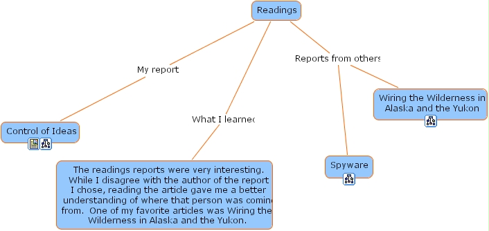 readings, control of ideas, spyware, wiring the wilderness in alaska and the yukon, readings, the readings reports were very interesting. while i disagree with the author of the report i chose, reading the article gave me a better understanding of where that person was coming from. one of my favorite articles was wiring the wilderness in alaska and the yukon.
