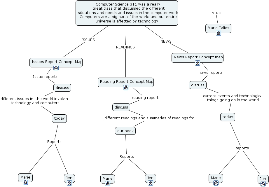 reading, discuss, today, today, marie, jen, discuss, issues report concept map, our book, reading report concept map, discuss, marie, news report concept map, marie talios, jen, jen, computer science 311 was a really great class that discussed the different situations and needs and issues in the computer world. computers are a big part of the world and our entire universe is affected by technology. , marie