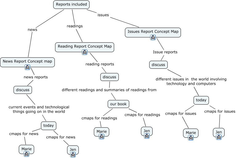 This Concept Map, created with IHMC CmapTools, has information related to: 2ndlevelcmap, Reading Report Concept Map readings Reports included, Issues Report Concept Map Issue reports discuss, Jen cmaps for issues today, News Report Concept map news Reports included, Reading Report Concept Map reading reports discuss, Jen cmaps for readings our book, Marie cmaps for issues today, Marie cmaps for news today, Jen cmaps for news today, Issues Report Concept Map issues Reports included, discuss different issues in the world involving technology and computers today, Marie cmaps for readings our book, discuss different readings and summaries of readings from our book, discuss current events and technological things going on in the world today, News Report Concept map news reports discuss
