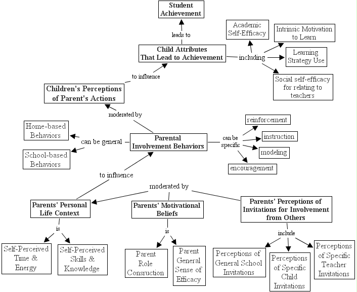 hds model sept 03, social self-efficacy for relating to teachers, school-based behaviors, parent general sense of efficacy, self-perceived time & energy, child attributes that lead to achievement, reinforcement, parents' perceptions of invitations for involvement from others, perceptions of specific teacher invitations, home-based behaviors, perceptions of specific child invitations, self-perceived skills & knowledge , parental involvement behaviors, modeling, instruction, intrinsic motivation to learn, parent role consruction, parents' motivational beliefs, learning strategy use, encouragement, children's perceptions of parent's actions, student achievement, perceptions of general school invitations, parents' personal life context, academic self-efficacy