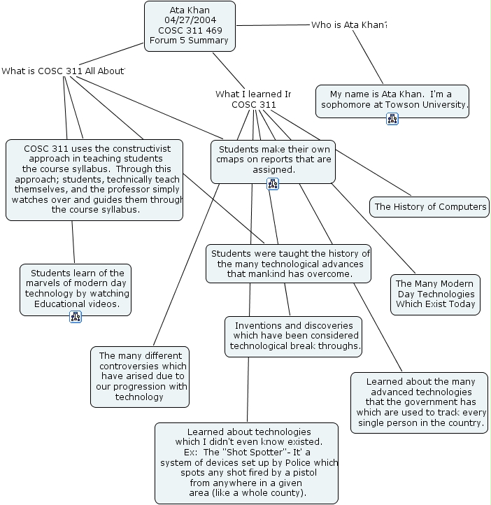 forum 5 summary, ata khan 04 27 2004 cosc 311 469 forum 5 summary, students learn of the marvels of modern day technology by watching educational videos., the history of computers, students were taught the history of the many technological advances that mankind has overcome., students make their own cmaps on reports that are assigned., my name is ata khan. i'm a sophomore at towson university., inventions and discoveries which have been considered technological break throughs., the many modern day technologies which exist today, learned about technologies which i didn't even know existed. ex the shot spotter - it' a system of devices set up by police which spots any shot fired by a pistol from anywhere in a given area (like a whole county)., learned about the many advanced technologies that the government has which are used to track every single person in the country., the many different controversies which have arised due to our progression with technology , cosc 311 uses the constructivist approach in teaching students the course syllabus. through this approach students, technically teach themselves, and the professor simply watches over and guides them through the course syllabus.