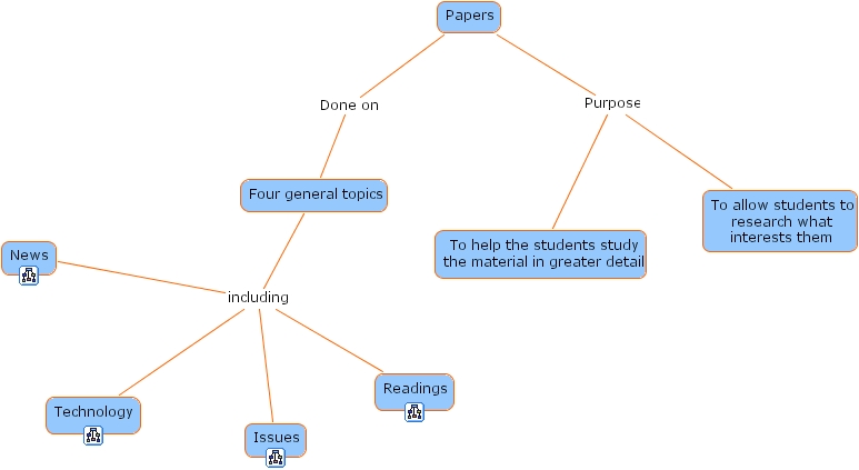 papers, technology, to help the students study the material in greater detail, readings, four general topics, papers, news, to allow students to research what interests them, issues