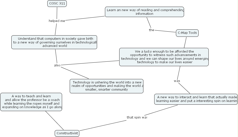 cosc311 helped me understand, a way to teach and learn and allow the professor be a coach while learning the ropes myself and expanding on knowledge as i go along, constructivist, c-map tools, learn an new way of reading and comprehending information, understand that computers in society gave birth to a new way of governing ourselves in technologically advanced world, a new way to interact and learn that actually made learning easier and put a interesting spin on learning, we a lucky enough to be afforded the opportunity to witness such advancements in technology and we can shape our lives around emerging technology to make our lives easier, technology is ushering the world into a new realm of opportunities and making the world a smaller, smarter community, cosc 311