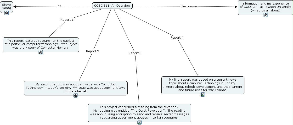 overviewcmap3, information and my experience of cosc 311 at towson university (what it's all about), steve nahaj, this report featured research on the subject of a particular computer technology. my subject was the history of computer memory., my final report was based on a current news topic about computer technology in society. i wrote about robotic development and their current and future uses for war combat., my second report was about an issue with computer technology in today's society. my issue was about copyright laws on the internet., this project concerned a reading from the text book. my reading was entitled the quiet revolution . the reading was about using encryption to send and receive secret messages reguarding government abuses in certain countries., cosc 311 an overview