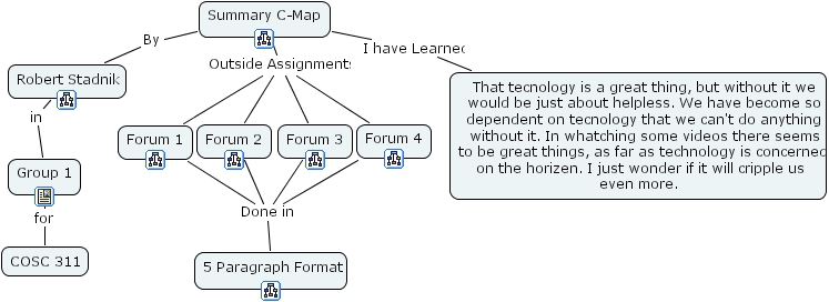 summary c map, forum 2, robert stadnik, that tecnology is a great thing, but without it we would be just about helpless. we have become so dependent on tecnology that we can't do anything without it. in whatching some videos there seems to be great things, as far as technology is concerned, on the horizen. i just wonder if it will cripple us even more., summary c-map, forum 1, 5 paragraph format, forum 3, group 1, cosc 311, forum 4