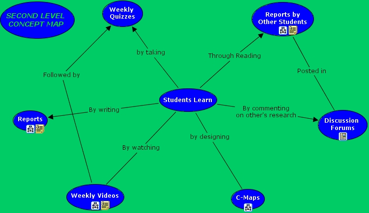 how we learn, weekly quizzes, reports, students learn, second level concept map, weekly videos, reports by other students, c-maps, discussion forums