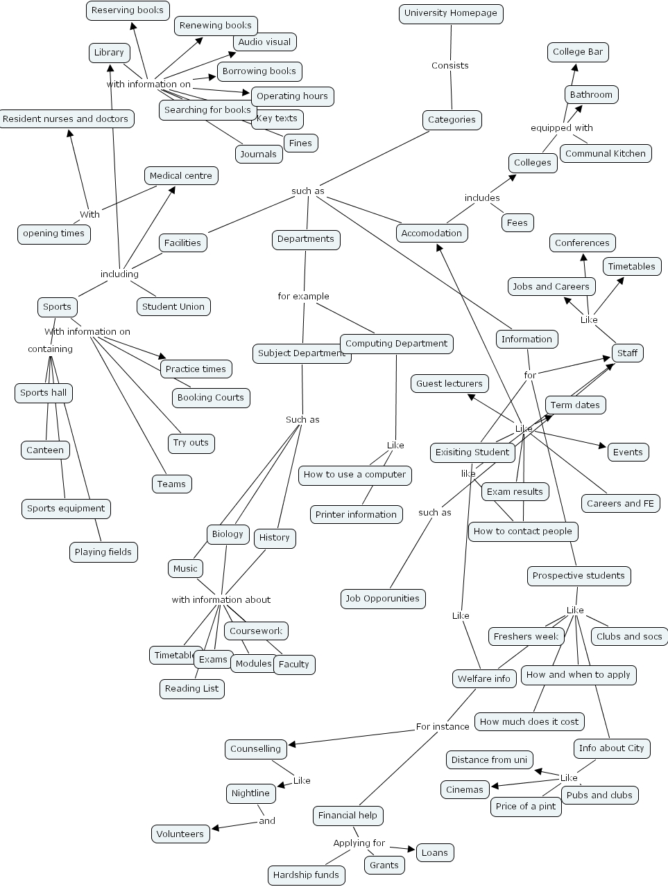 Nightline and Volunteers, Sports containing Playing fields, Sports containing Sports equipment, Sports containing Sports hall, Sports containing Canteen, Staff such as Job Opporunities, Medical centre With Resident nurses and doctors, Medical centre With opening times, Welfare info For instance Counselling, Welfare info For instance Financial help, University Homepage Consists Categories, Info about City Like Pubs and clubs, Info about City Like Price of a pint, Info about City Like Cinemas, Info about City Like Distance from uni, Exisiting Student Like Accomodation, Exisiting Student Like Events, Exisiting Student Like Careers and FE, Exisiting Student Like How to contact people, Exisiting Student Like Guest lecturers, Exisiting Student Like Term dates, Exisiting Student Like Exam results, History with information about Coursework, History with information about Modules, History with information about Exams, History with information about Reading List, History with information about Faculty, History with information about Timetable, Computing Department Like Printer information, Computing Department Like How to use a computer, Prospective students Like How much does it cost, Prospective students Like How and when to apply, Prospective students Like Info about City, Prospective students Like Welfare info, Prospective students Like Freshers week, Prospective students Like Clubs and socs, Accomodation includes Fees, Accomodation includes Colleges, Library with information on Operating hours, Library with information on Searching for books, Library with information on Borrowing books, Library with information on Renewing books, Library with information on Key texts, Library with information on Journals, Library with information on Audio visual, Library with information on Fines, Library with information on Reserving books, Subject Department Such as Biology, Subject Department Such as History, Subject Department Such as Music, How to contact people like Staff, Information for Prospective students, Information for Exisiting Student, Information for Staff, Financial help Applying for Loans, Financial help Applying for Grants, Financial help Applying for Hardship funds, Staff Like Timetables, Staff Like Conferences, Staff Like Jobs and Careers, Exisiting Student Like Welfare info, Facilities including Medical centre, Facilities including Library, Facilities including Student Union, Facilities including Sports, Categories such as Information, Categories such as Accomodation, Categories such as Departments, Categories such as Facilities, Music with information about Coursework, Music with information about Modules, Music with information about Exams, Music with information about Reading List, Music with information about Faculty, Music with information about Timetable, Departments for example Subject Department, Departments for example Computing Department, Colleges equipped with Bathroom, Colleges equipped with Communal Kitchen, Colleges equipped with College Bar, Sports With information on Teams, Sports With information on Try outs, Sports With information on Booking Courts, Sports With information on Practice times, Counselling Like Nightline, Biology with information about Coursework, Biology with information about Modules, Biology with information about Exams, Biology with information about Reading List, Biology with information about Faculty, Biology with information about Timetable